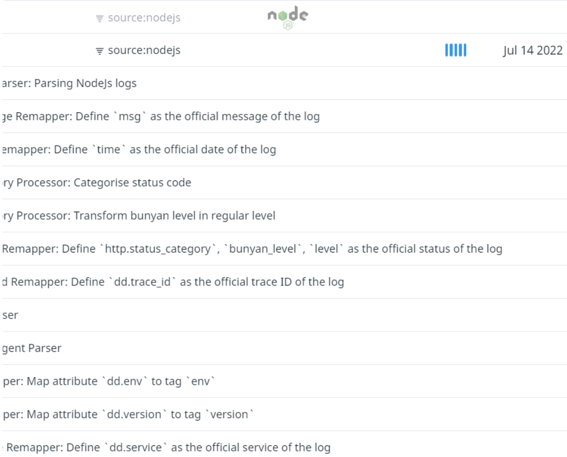 데이터독 로그는 기본적으로 source 언어에 따라 기본적인 로그 파이프라인을 제공한다. 아래와 같이 Application source를 지정하면 Node.js 관련 로그파이프라인이 자동적으로 생성된다. 컨테이너 환경의 경우에는 stdout 로그를 자동으로 가져온다. 다만 Application 에서 log4j나 winston과 같은 json 포맷의 로그 lib를 사용해야 한다. 로그가 json 포맷이 아닐 경우 파이프라인을 메뉴얼 하게 구성해야 한다.