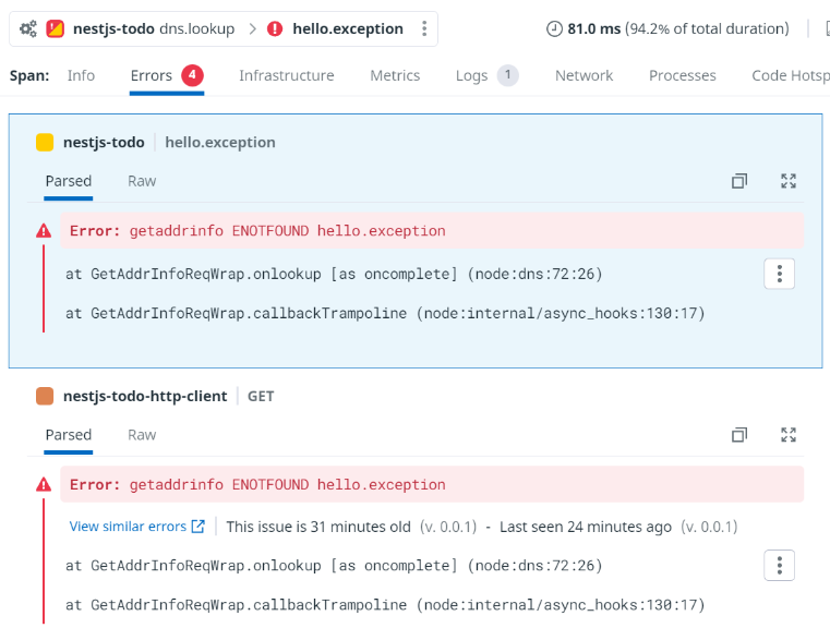 https 관련 모듈은 dd-trace(node.js)에서 호환 되어 있기 때문에 해당 exception을 바로 확인할 수 있다.