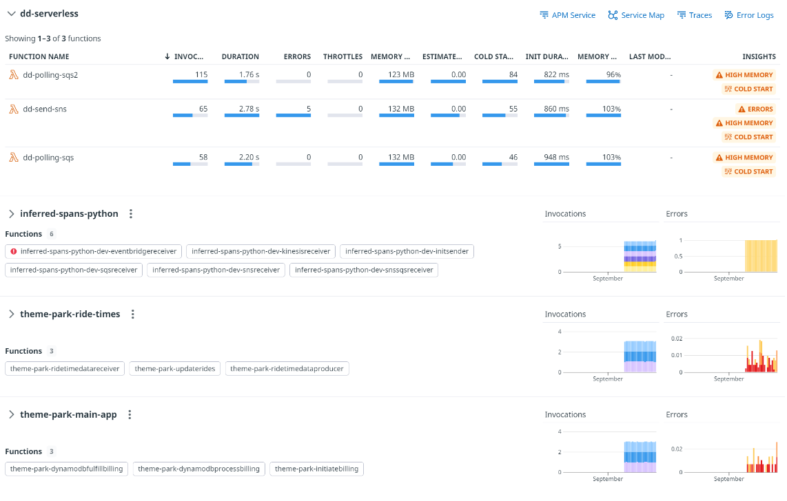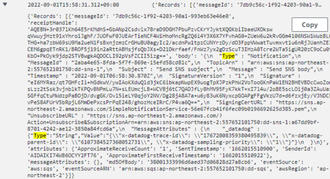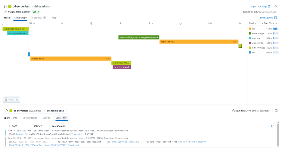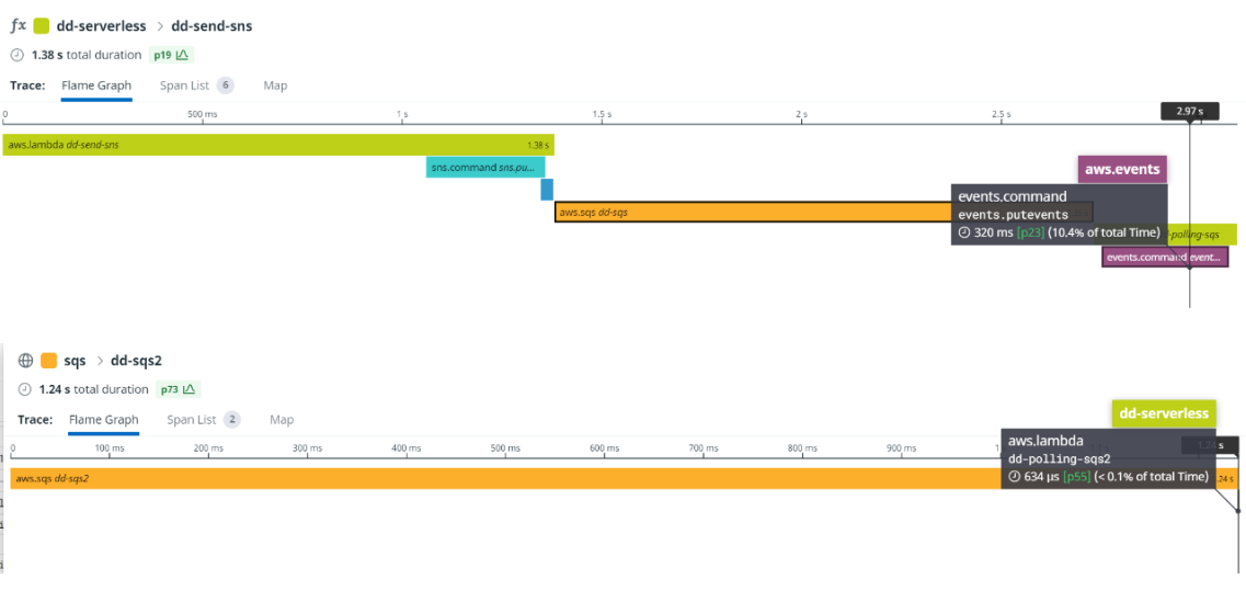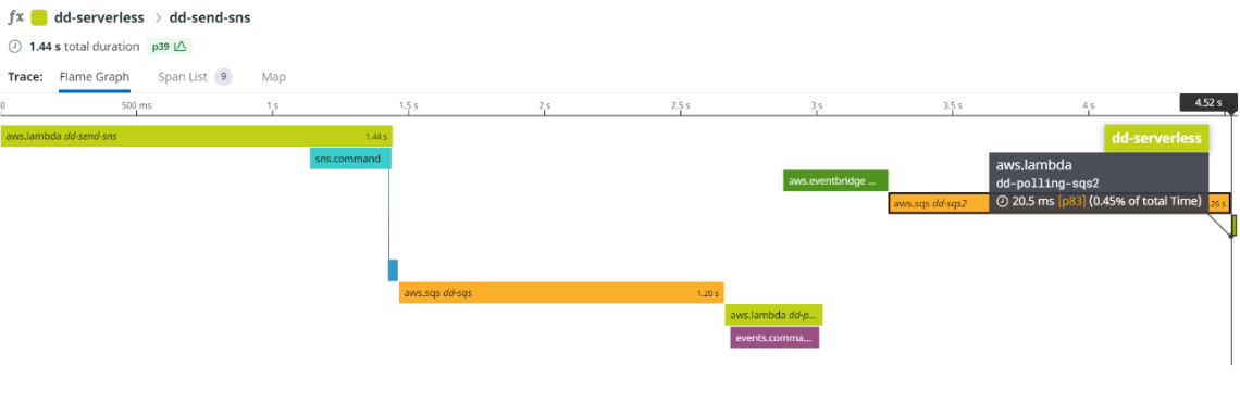 하지만 위 프레임그래프를 보면 SNS -> SQS -> Lambda의 형태는 Datadog에서 지원한다.