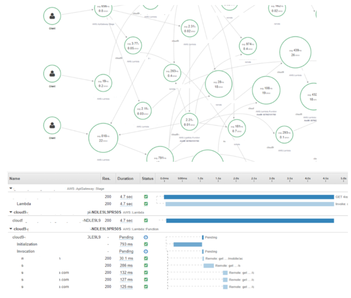 APM의 경우 약간은 불편하지만 AWS X-Ray를 이용하면 가능하다. 각 API Gateway 호출에 따른 Lambda 수행 및 DB 경로까지 알 수 있으며 Latency도 확인할 수 있다.