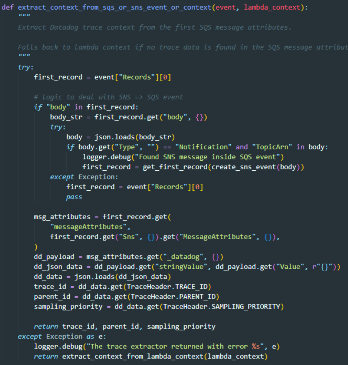 tracing.py 200번 라인에 SQS Event 발생 시 어트리뷰트에서 SNS을 확인하고 Trace, Span, Parent ID 등 프레임그래프를 위한 정보를 넣어주는 펑션을 확인할 수 있다.