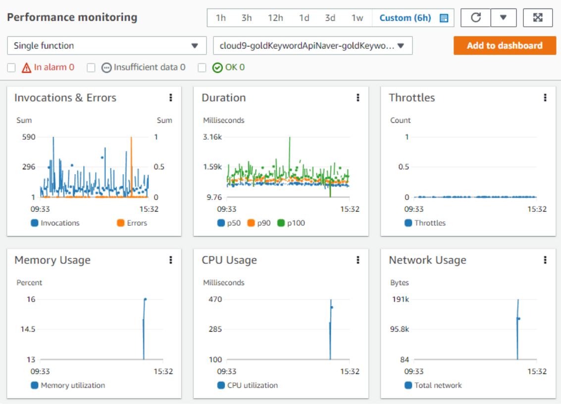 (Invocation&Error, Duration, Throttles, Memory, CPU, Network, Incvocation 별 리소스 사용률)