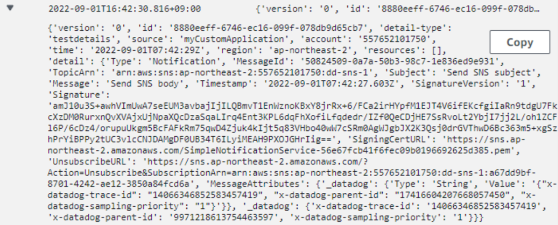 그러나 EventBridge -> SQS -> Lambda의 경우 아래와 같은 Event가 발생된다. 따라서 Datadog은 해당 Event를 제대로 인식하지 못하고, EventBridge와 SQS 각각의 인풋으로 인식한다.