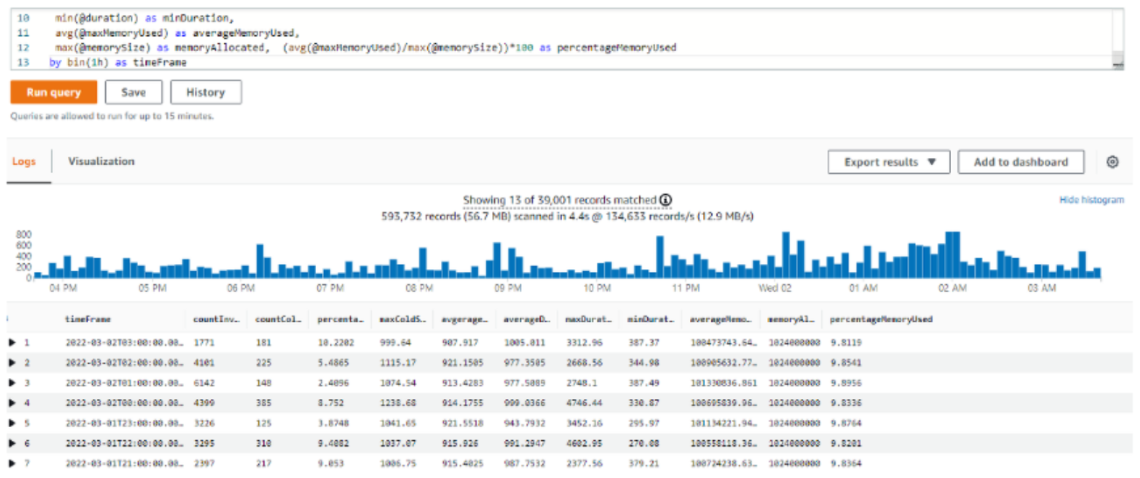 이를 통해 쿼리를 만들고, 각 Lambda 함수 별 콜드스타트를 확인할 수도 있다.