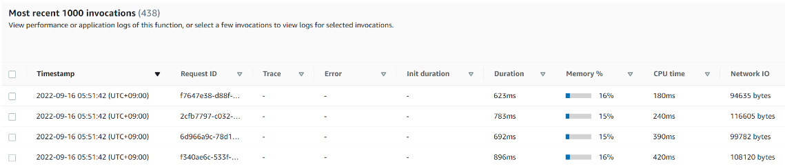 개별 펑션에 대한 전반 리소스 사용 정보(Cold starts, memory, cpu, network)